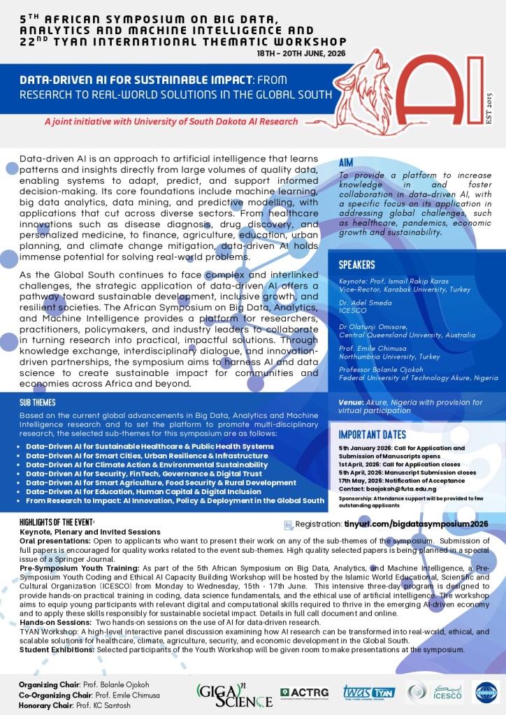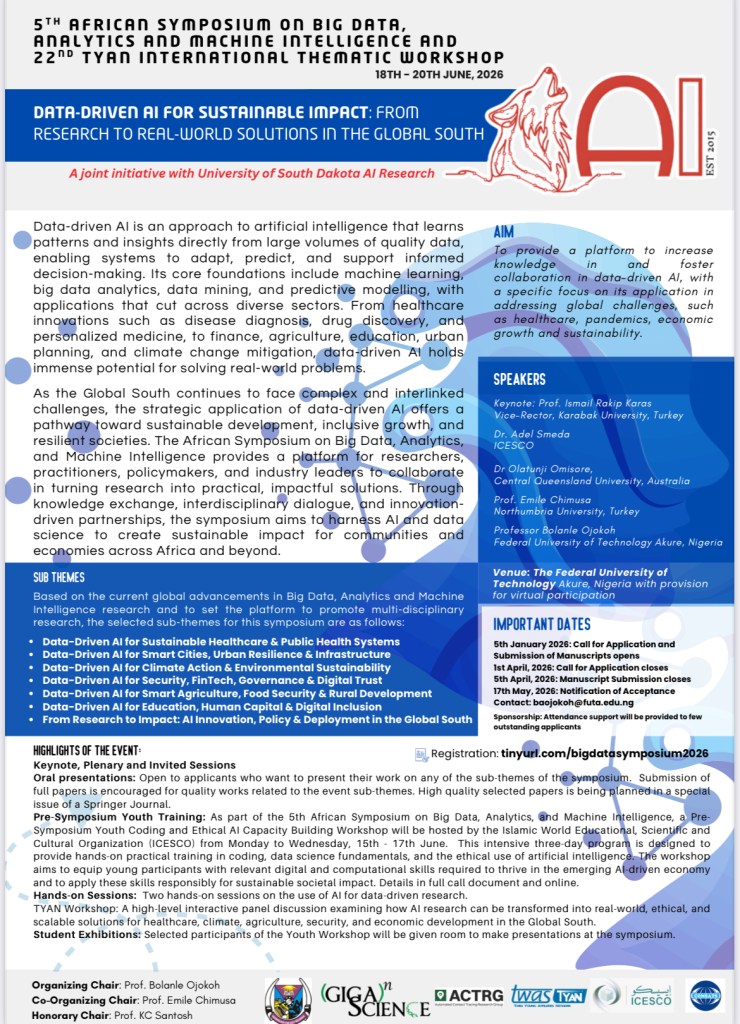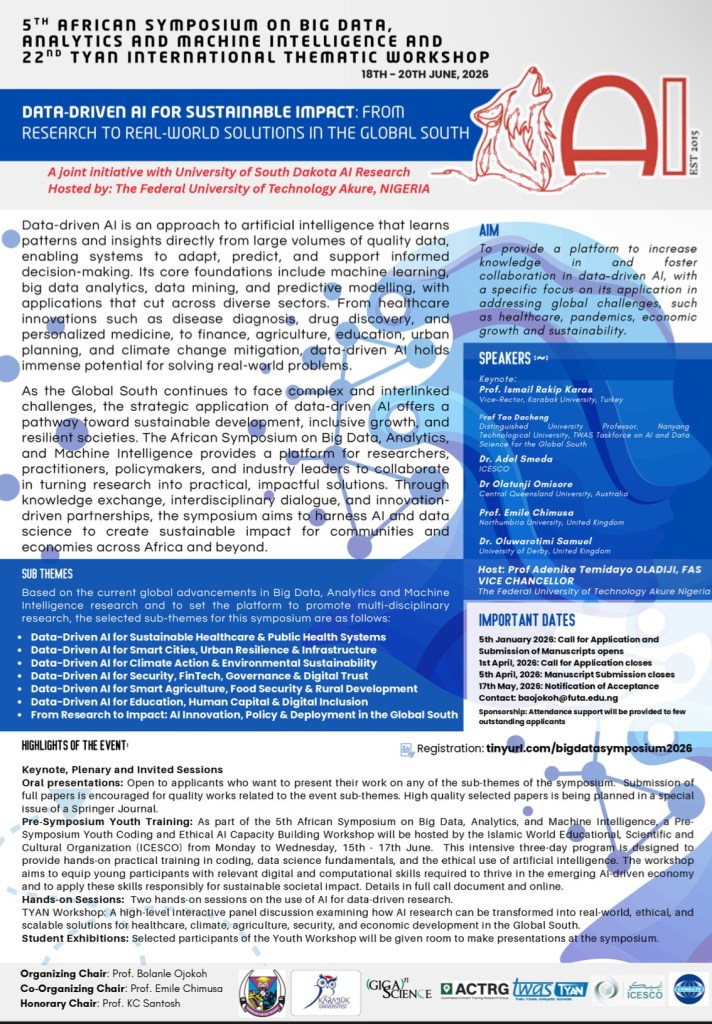 The 5th African Symposium on Big Data, Analytics and Machine Intelligence will take place in hybrid format from June 18–20, 2026, at Akure, Nigeria. The symposium is a joint initiative of the Federal University of Technology, Akure and the University of South Dakota AI Research. Held alongside the 18th TYAN International Thematic Workshop and a Pre-Symposium Youth Coding and Ethical AI Workshop, the event will feature keynote, plenary, and panel sessions by leading global experts.